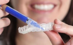 São confeccionadas placas personalizadas em silicone, onde o próprio paciente dispõe o gel clareador fornecido pelo dentista, na concentração ideal para cada caso, e as utiliza durante a noite. Embora seja mais lenta que a técnica à laser, levando em média 15 dias para o resultado final, o clareamento caseiro é tão eficiente quanto, oferecendo resultados estéticos idênticos ao laser, com a vantagem de melhor controle quanto à sensibilidade dentária.
